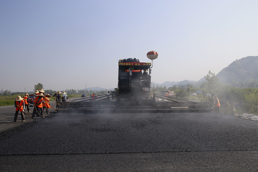 2019年8月,宜春經(jīng)開區(qū)S311路面攤鋪現(xiàn)場,工友們輔助路面兩側(cè)的分料、補窩等作業(yè)